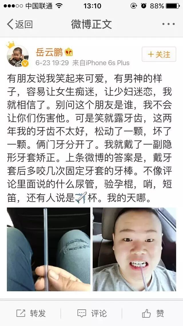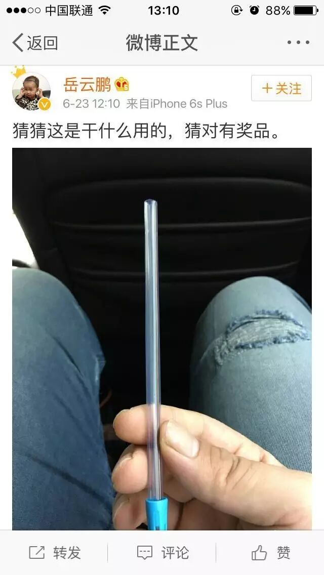 前几天,小岳岳在微博上晒出了一条神秘透明棒状物体(咦?),评论立马炸开了锅,有的说是体温计,有的说是尿管、验孕棒,甚至还有污师说是飞机杯(小岳岳脸.jpg),连小岳岳也对网友们的脑洞惊呼“我的天哪 !”