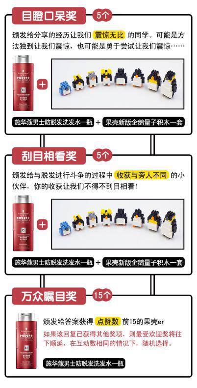 如何参与呢?回帖大家都会,形式不限,当然越丰富越好。如果你图文并茂,那想必真的是饱受脱发之苦或对我们的奖品有深刻的渴望啦~