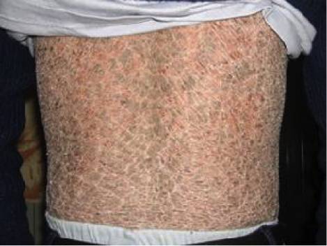 上图中的就是寻常型鱼鳞病,也是最常见的一型鱼鳞病。一般出现在小腿外侧,严重一点的双臂和躯干也会累及。典型皮损是这种像鱼鳞或者蛇皮一样的深色菱形或多边形鳞屑,紧贴在皮肤上,部分边缘可游离。95%的患者都会在3岁前出现,然后一些同时罹患中二病的孩纸就会每天YY自己是不是人蛇禁忌の恋.avi的产生的半妖,不过多半被老爸老妈爱的铁拳深切关怀下就老实了……嗯,比如我妈……