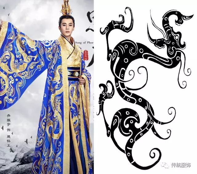 此剧还少量使用了西汉马王堆墓里的一些织绣纹样,但是是拆散了使用的。我也就不吐槽这个时代差异了,直接来看此剧服装服装设计师的用法吧。