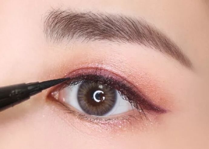 选择一款显色力好的眼线笔,沿着睫毛根部,画一条粗细适中的眼线。一定要记住,不要随意拉长或加粗眼线,这会让眼妆的凌厉感太强。