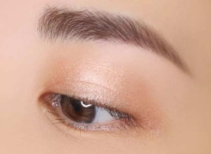 然后取一款粉棕色的珠光眼影,用小头晕染刷少量多次晕染在双眼皮褶皱内部,然后再稍稍带一点颜色到下眼睑后三分之一的位置。