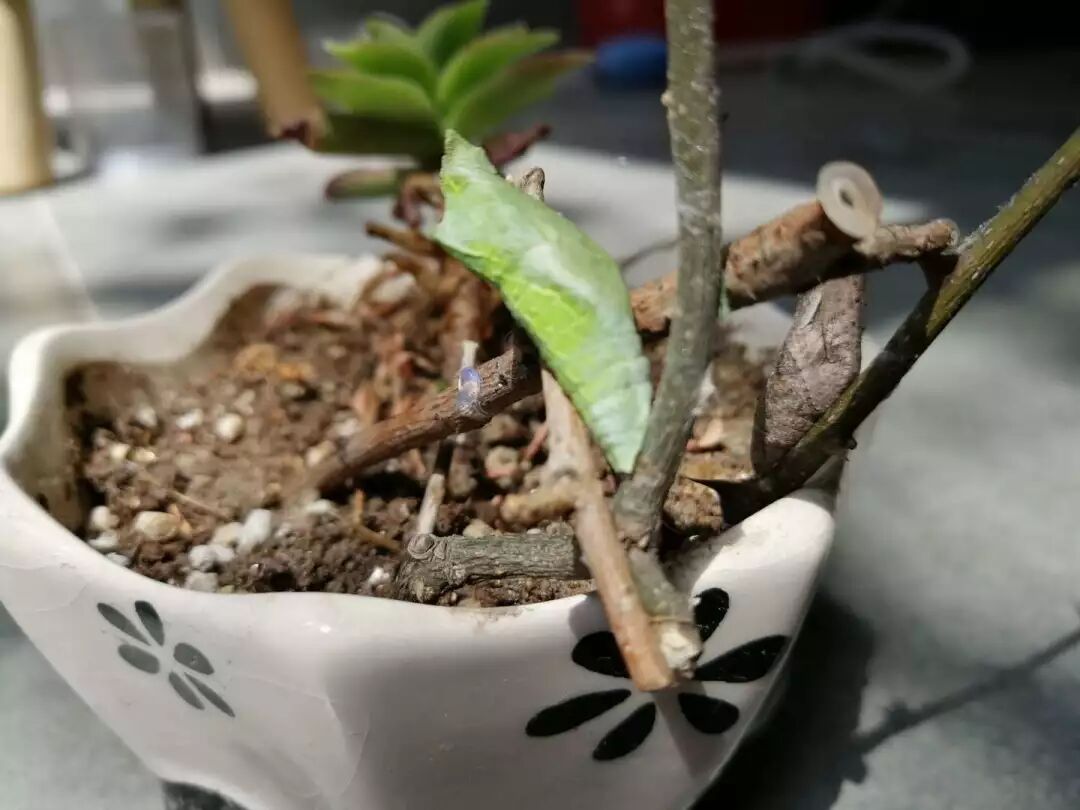 解决了柑橘凤蝶的“住房”的问题,该解决幼虫“吃”的问题了。因为我家楼下就有一棵花椒树,故而为幼虫找食物比较容易,如果附近没有芸香科植物,可以尝试在家里种一棵盆栽的花椒树或者芸香科植物,这样既能给幼虫提供稳定的食物又能解决家里绿化问题。