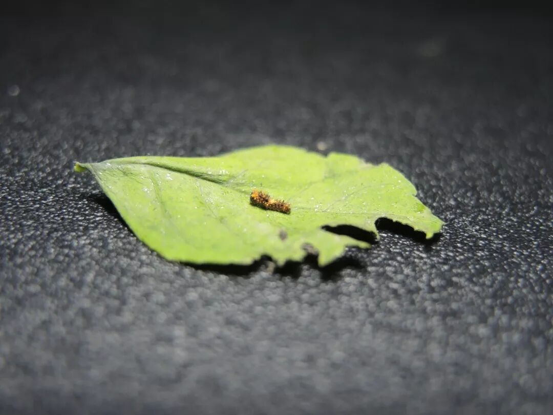 准备工作做好了,我们就可以到树上采卵或者幼虫回家了,雌蝶会将单个卵产在叶面上,仔细寻找,就能在叶子上发现针尖大小的蝶卵。将卵连同叶子一起摘下,放置入饲养容器中,柑橘凤蝶幼虫是可以混养的,不会像有些鳞翅目昆虫,同类幼虫会发生争斗现象,打得你死我活,但不建议将低龄幼虫混养,因为低龄幼虫个儿太小,收拾没吃完的剩叶的时候容易忽略将其扔掉。