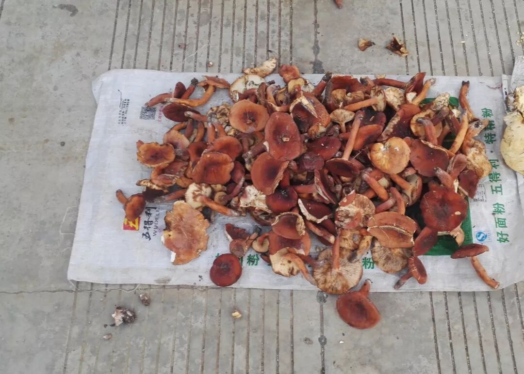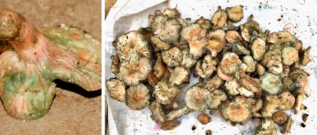 受伤后变成铜绿色的松乳菇和市场上售卖的松乳菇。