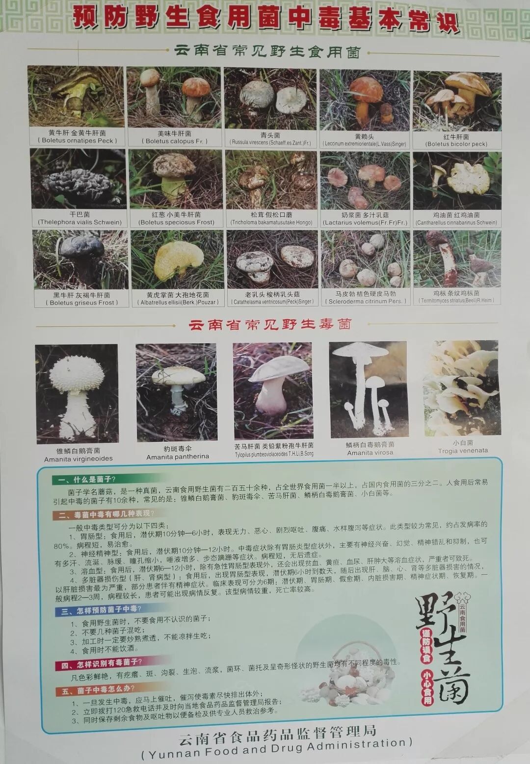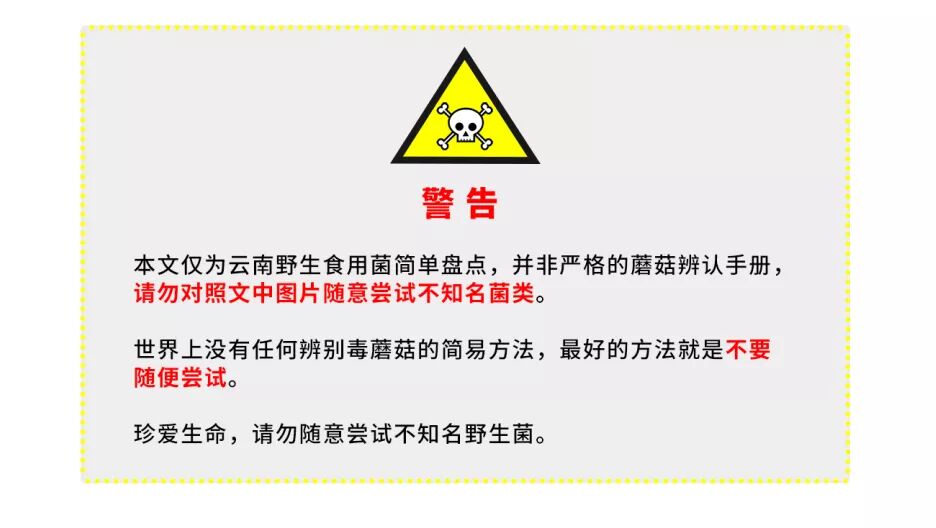 以上无特殊说明的蘑菇都可放心食用,而其本身具有毒性或是与毒菌酷似的要留心,即使是所谓山民采集的也需要谨慎。世界上没有任何辨别毒蘑菇的简易方法,最好的方法就是不要吃。自己没有经验千万不能在野外采集蘑菇食用,很多人就是这么中毒然后挂掉的。网上流传的各种毒蘑菇辨别大法大多是误导,谁信谁中招。云南市场上偶尔也会出现毒菌,哪怕很有经验的采蘑菇的大叔大娘也会翻车。所以,尽量购买大家都在卖的野生菌,那些一枝独秀的菌就尽量不要去尝试。