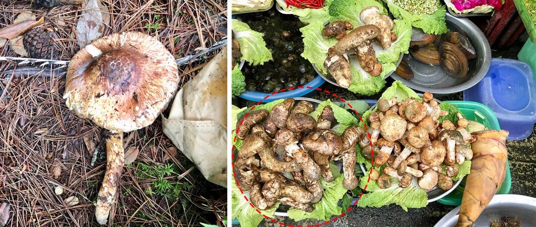 山民刚采集的新鲜松茸和餐馆摆出的松茸。