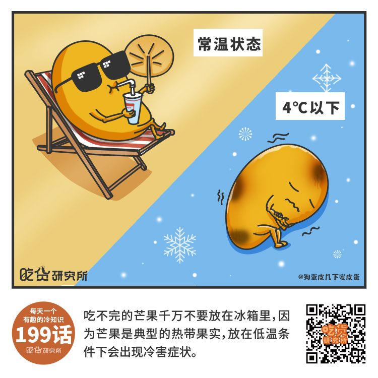 芒果、菠萝等热带水果放入低温环境里保存,很容易被冻伤。果皮会出现黑斑,果肉也会有水渍样的变化,风味儿很快丧失。倒是放在室温之下,能保持更久。不过芒果容易风干脱水,还是趁早吃到肚子里比较实在。
