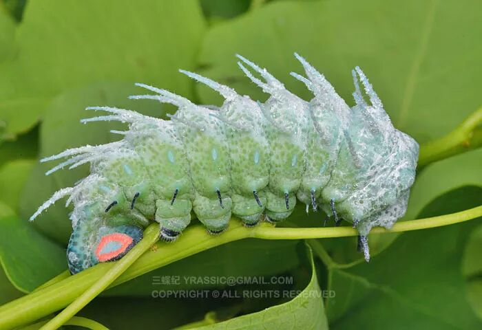 乌桕大蚕蛾的幼虫体短而粗壮,全身青绿色,密布一层蜡粉,头部和背部都有竖起的棘突,看上去好像长满了刺儿。它的足上有趾钩,可以牢牢固定在植物上,大龄幼虫尾节有一个红斑。
