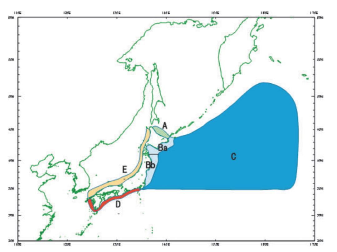 图中A、Ba、Bb与C为O种群主要生活区域,D和E为J种群主要生活区域。图片:Mutsuo Goto et al. / Technical Reports of the Institute of Cetacean Research(2017)