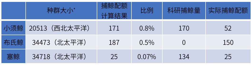 上表中的“种群大小”数据来自日本水产厅公告,未经同行评议。此处的种群是指整个区域的数量,不等同生物学的种群。这里的“科研捕鲸量”可能是计划量。