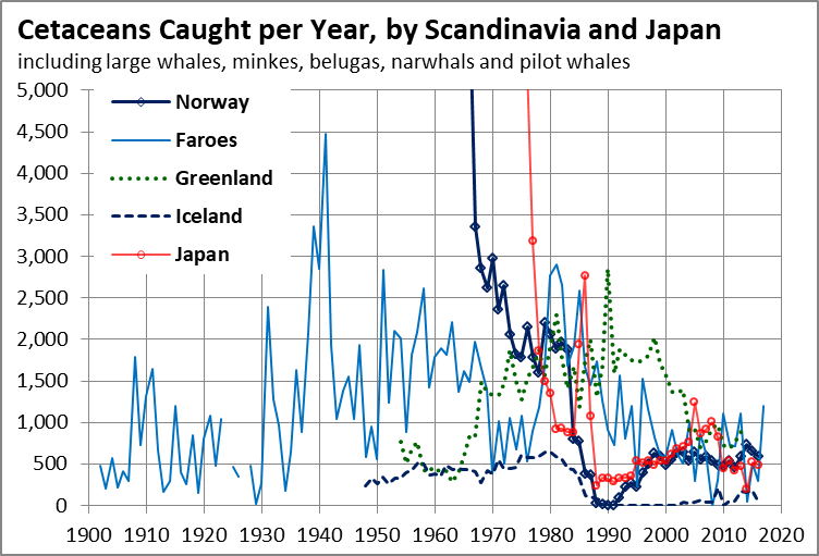 从20世纪到21世纪初,几个国家或地区的逐年捕鲸量,鲸的种类包括小须鲸、白鲸、一角鲸和领航鲸等。可以看到,1970年代是一个下降的拐点。图片:Numbersinstitute
