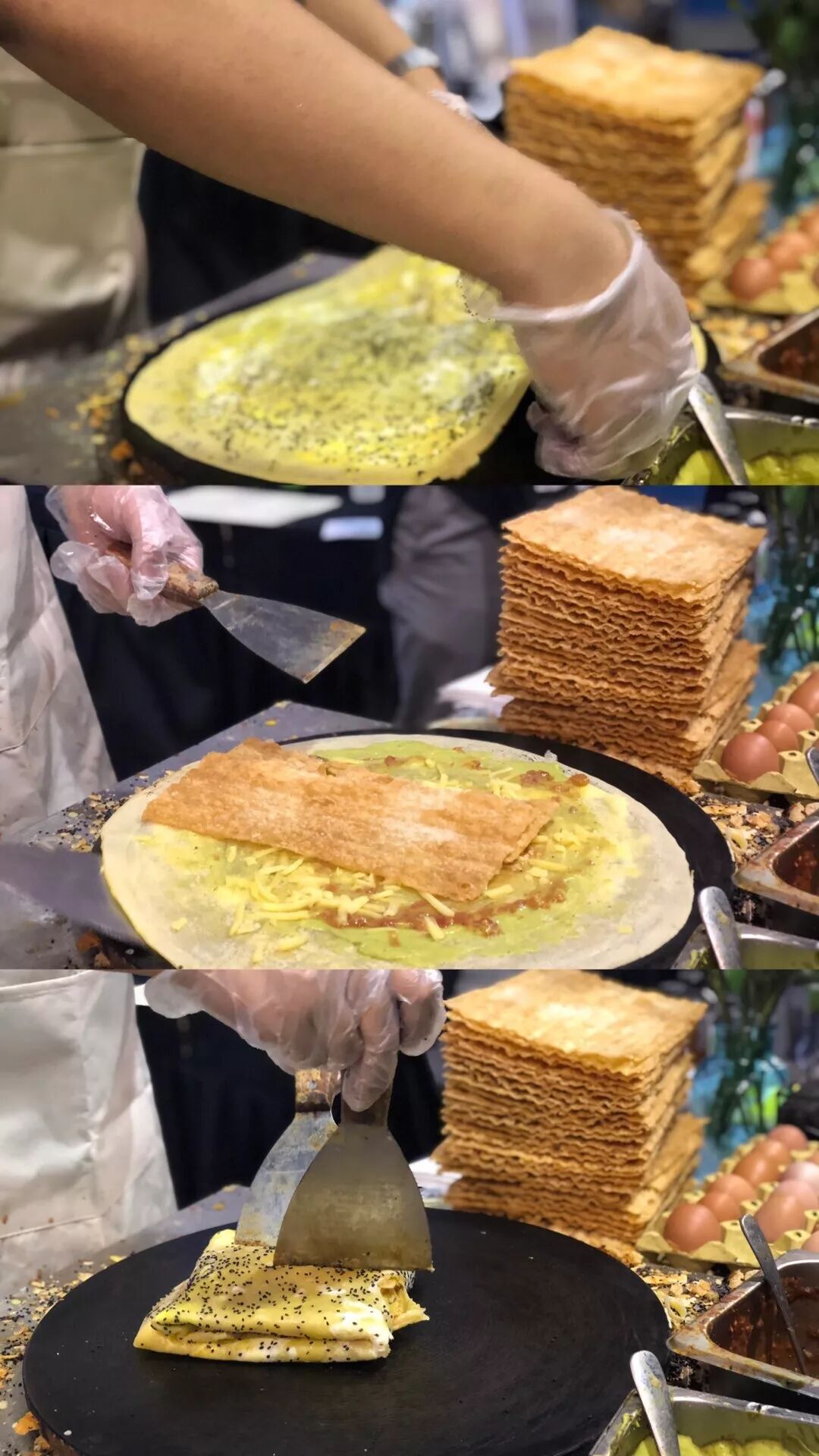 牛油果子AVOCADO也是凭借牛油果独特的香气和煎饼果子自带流量,吸引了大波少男少女排队购买。小哥哥娴熟的手法,让牛油果、芝麻、芝士巧妙结合,所长三下五除二就吃完了一个。