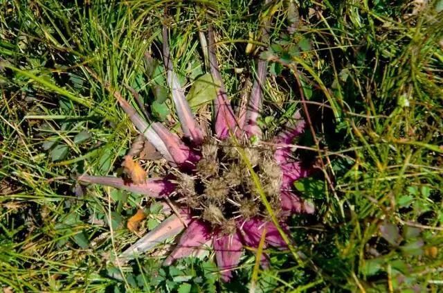 6月底,水母雪兔子的圆盘中央会向上凸起,意味着它要长出直立的地上茎了;8月份,水母雪兔子的地上茎能长到20cm高,外面披着羽状分裂的苞叶和浓密的蛛丝状毛。