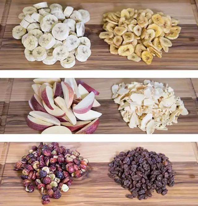 看看下图中经过冻干和脱水后的香蕉、苹果和葡萄,第一眼还以为左侧的都是新鲜水果呢。
