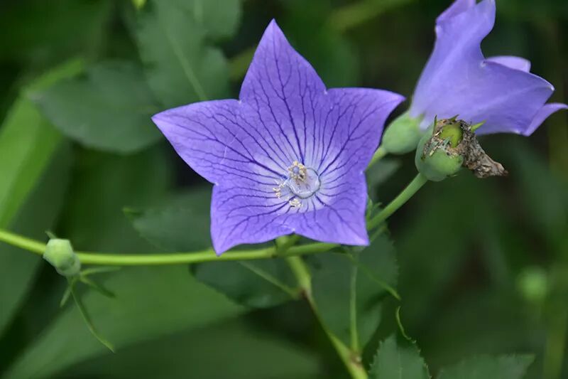 桔梗的花通常在上午开放,合在一起的淡蓝紫色“小包袱”,沿着彼此镊合状排列的花冠裂片的缝隙逐渐打开,完全开放后成为一个五裂的漏斗型钟状花冠,从花冠正面看就是一个十分标致的蓝紫色五芒星。