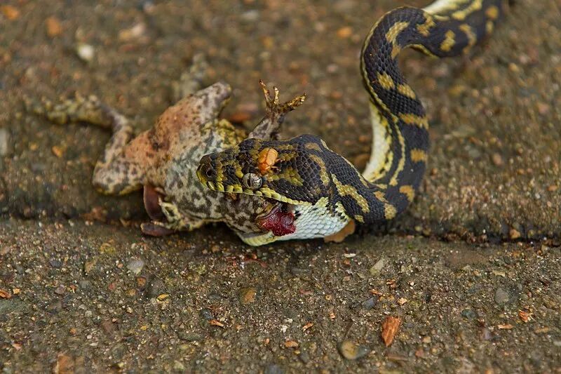 这条不幸的地毯蟒(Morelia spilota)企图吞食海蟾蜍,却被后者的毒液毒死了。图片:Andrew Mercer/ wikimedia