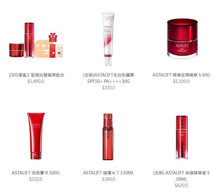 从香港网站上看,ASTALIFT单品的定价在日系护肤品当中算是中高端的定位。也有平价的副线Lunamer和Lunamer AC,主打功效分别是美白和祛痘。
