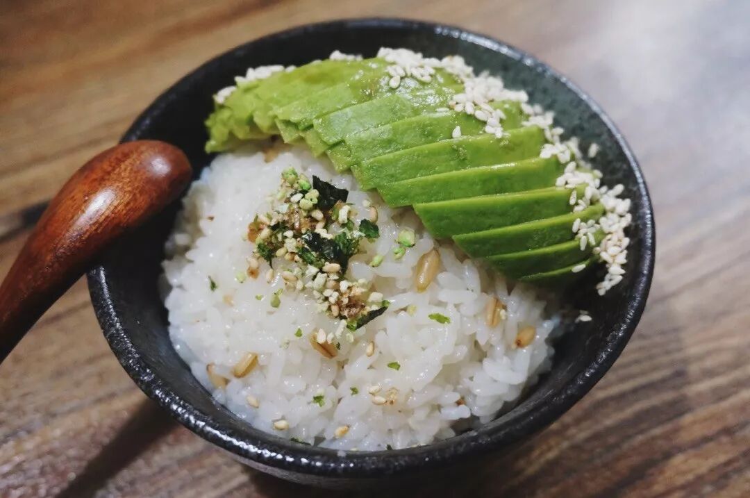 牛油果拌饭:不用去日料店也能吃到这种简易的牛油果拌饭!煮好的米饭放入寿司醋拌匀后,放入切片的牛油果,加一勺酱油,撒上味岛香松和白芝麻即可。喜欢山葵也可以用山葵拌!