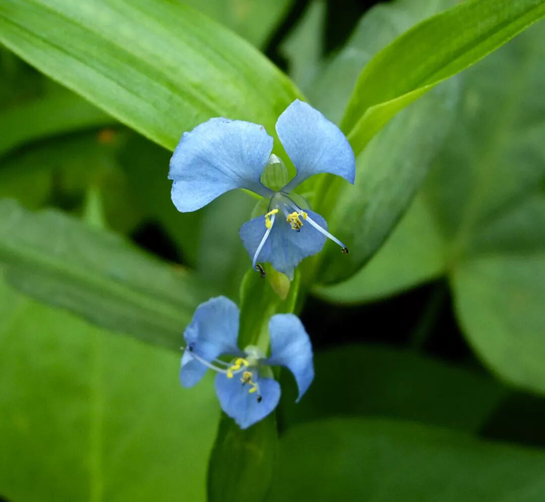 郊外的野花自然是要多一些,比如鸭跖草科的“科长”鸭跖草(Commelina communis),开着非常显眼的小蓝花,每朵花有两片亮蓝色的花瓣。它有两个同属的小弟,饭包草(C. bengalensis)和竹节菜(C. diffusa),乍一看非常相似,但前者的叶形与鸭跖草不太一样,后者则有3片蓝色花瓣,可以区别。