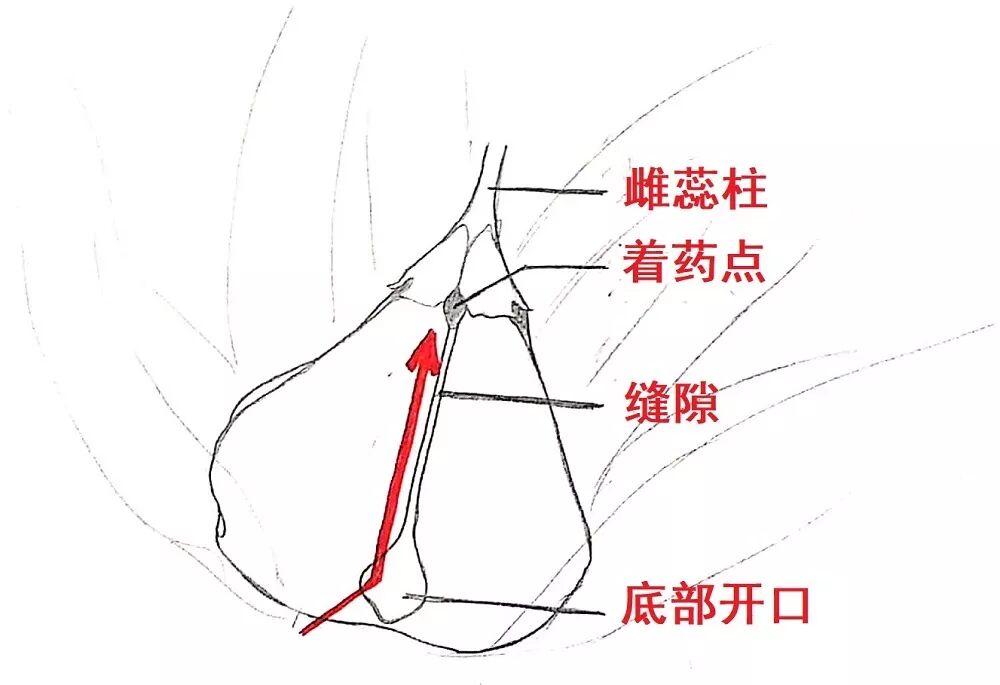 天蛾用自己长长的嘴当吸管,乐滋滋地从萝藦花里喝“肥宅水”的时候,殊不知萝藦已经给它做了个危险的陷阱。伸到萝藦花底部的长嘴,有可能伸到合蕊冠底部的开口里去,稍微往上抬一点,就会被两边的雄蕊夹住,嘴巴卡在缝隙里。更要命的是,雄蕊上是有倒刺结构的,防止伸进去的嘴巴直接拔出来,天蛾想把自己的口器拿出来,就只能顺着缝隙继续往上走,一路滑到雄蕊的顶部。在这里有缝隙的另一端开口。