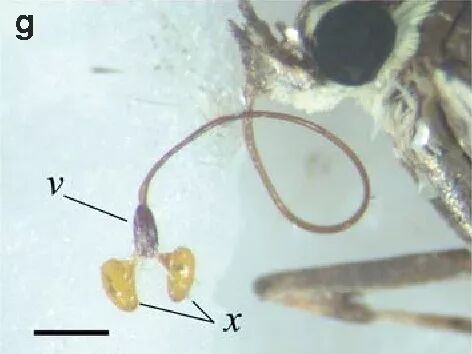 萝藦的着药点被扯下来挂在天蛾的口器上。图片:Shinji Sugiura et al. (2005) Journal of Plant Research 118(4):257-62