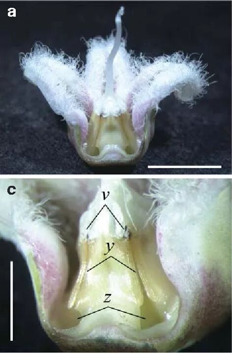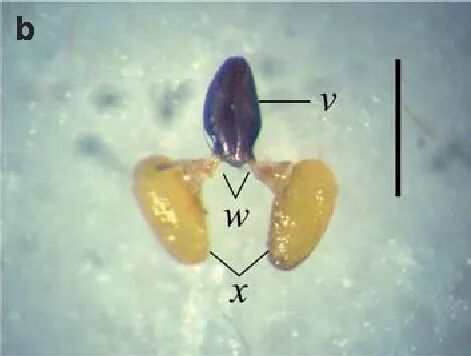 萝藦的着药点。字母v黑线深色东西是着药点(附着花药的点),字母x所指的黄色椭圆形是花药(产生花粉的器官)。图片:Shinji Sugiura et al. (2005) Journal of Plant Research 118(4):257-62