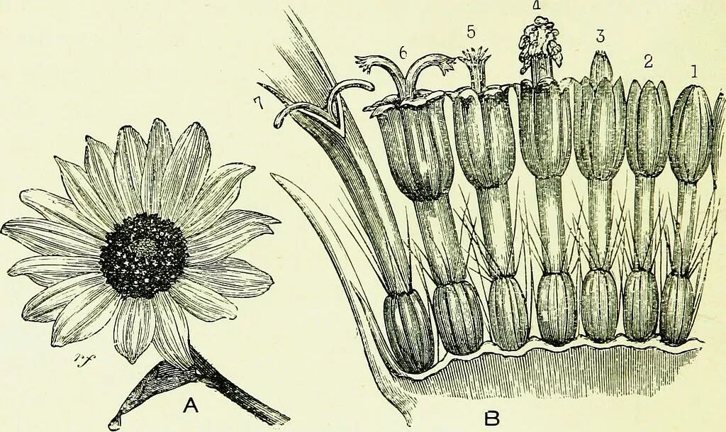菊科植物的花序。标有7的是舌状花,即“花朵”外圈的“花瓣”,1至6是管状花。图片:Internet Archive Book Images / Flickr