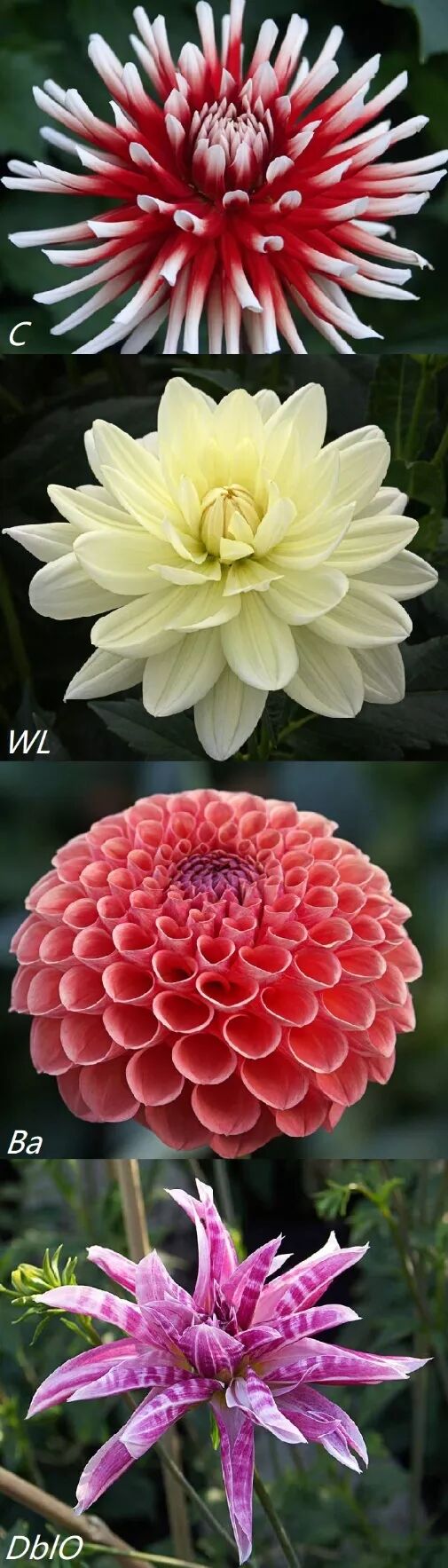 感受一下!从上到下分别是仙人掌状、睡莲状、球状和复兰花状的大丽花。图片:Marktee1 / Wikimedia Commons