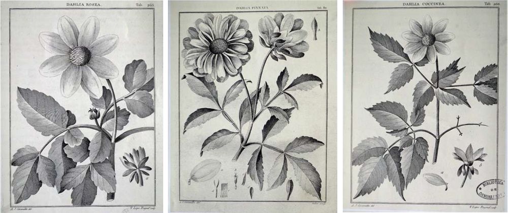 卡瓦尼列命名的三种大丽花属植物:中间是最先发表的大丽花(Dahlia pinnata),左右分别是按颜色分类的D. rosea(意为玫红色)和D. coccinea(意为大红色)。图片:Martin Král / The Dahlia in History
