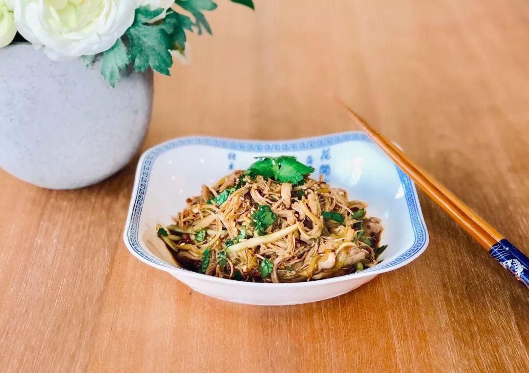 凉拌辣油香菜青瓜手撕鸡。图片:J的调味坊 / 豆果美食