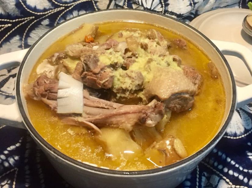 一款台湾版的姜母鸭更像是一锅药膳,其中,老姜不是配菜,和鸭肉的比例相当,把鸭肉和老姜用黑芝麻油煸香,加入米酒和中药包一起炖熟。老姜奠定全菜的基调,中药材负责提香,龙眼和枸杞用来增甜。每家的药包有不同的配方,也就生出了味道的差异。汤头鲜甜,鸭肉酥嫩,连老姜都焕发了姜生第二春。