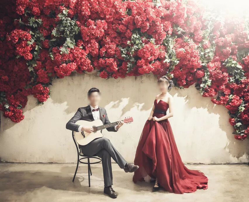 接下来是流水线感最明显的拍摄。此前我还担心现场想造型是不是很累,简直多虑:每个场景的姿势造型,手脚怎么摆,笑到什么程度,摄影师全都给你安排好了,并不会根据客人的不同而有啥区别和变化。每对新人都是一样的:来到场景1,摆好姿势,123,咔嚓;再到场景2,摆好场景2姿势,咔嚓咔嚓。如此走完整个流程。