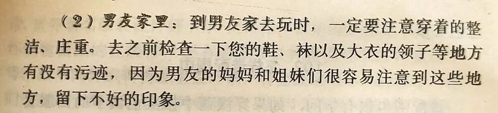 去男友家不是去玩的,而是去见你未来的婆婆的,这个坑连80年代的人都懂。指南非常贴心地让你在去之前检查一遍着装,以免被挑剔。不过进门之后的情况就要看你的造化了。
