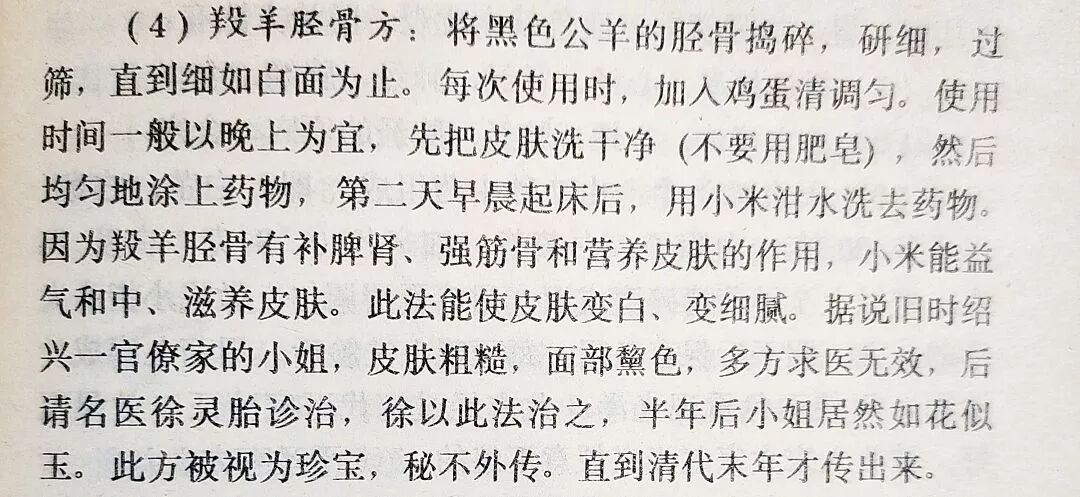 这个“羖(gǔ)羊胫骨方”的美白法,前半段像是《盗墓笔记》里防粽子的秘方,后半段像是《聊斋志异》里的故事。整个方子里透着一股幽幽的寒气,总觉得这位大小姐是不是晚上会被冤死的羊来索命。