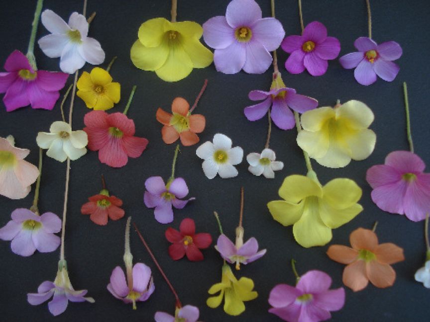 各种颜色的酢浆草花集合。图片:Ron Vanderhoff / pacificbulbsociety