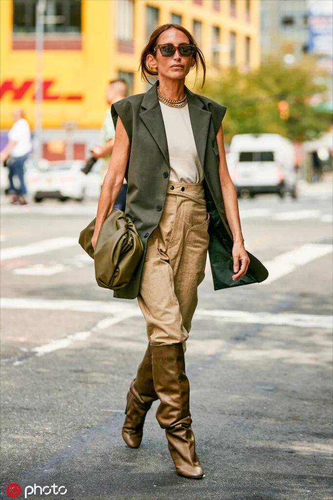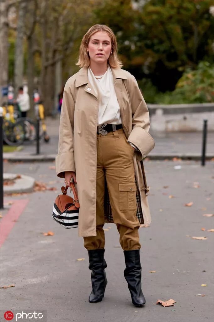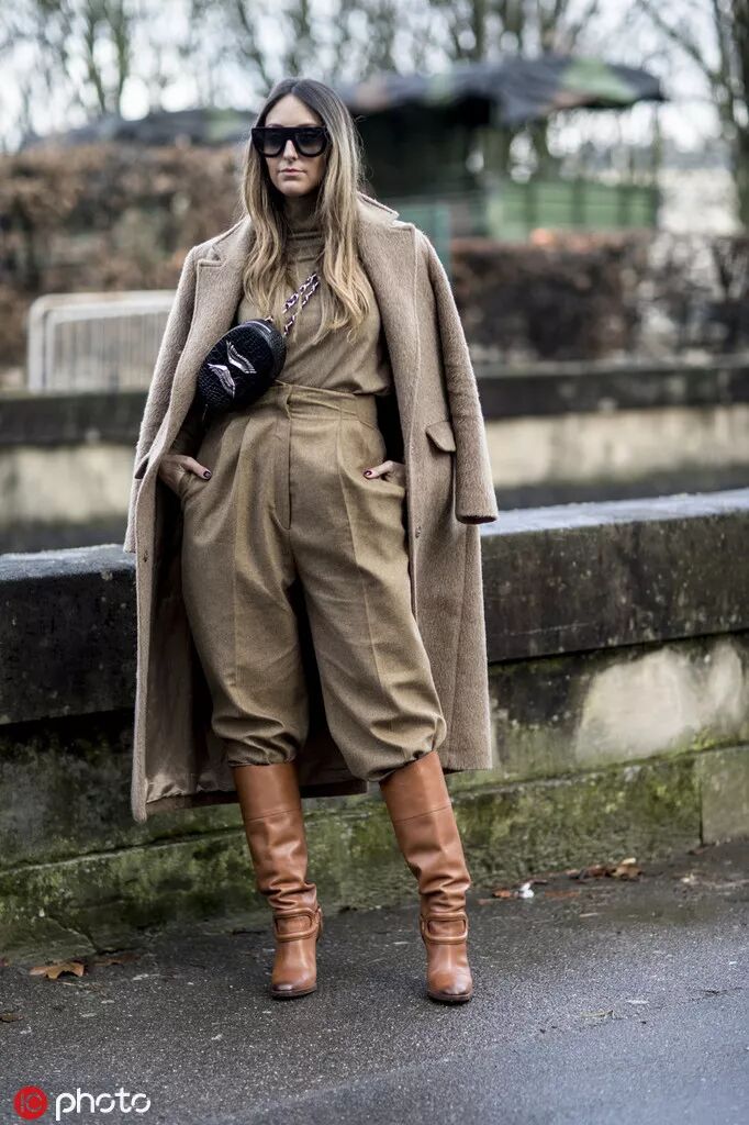 长筒靴和工装裤也是绝配了,有一种马术的优雅和帅气,棕色系最时髦,裤腿可以宽松也可以紧身,因不同搭配而异。