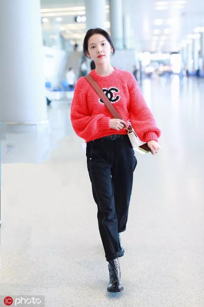 章若楠短款的红色毛衣非常少女,平衡了工装裤的中性帅气。注意!还是短款!如果你想更修饰身材,可以选择紧身的毛衣或者高领毛衣,保暖又时髦。