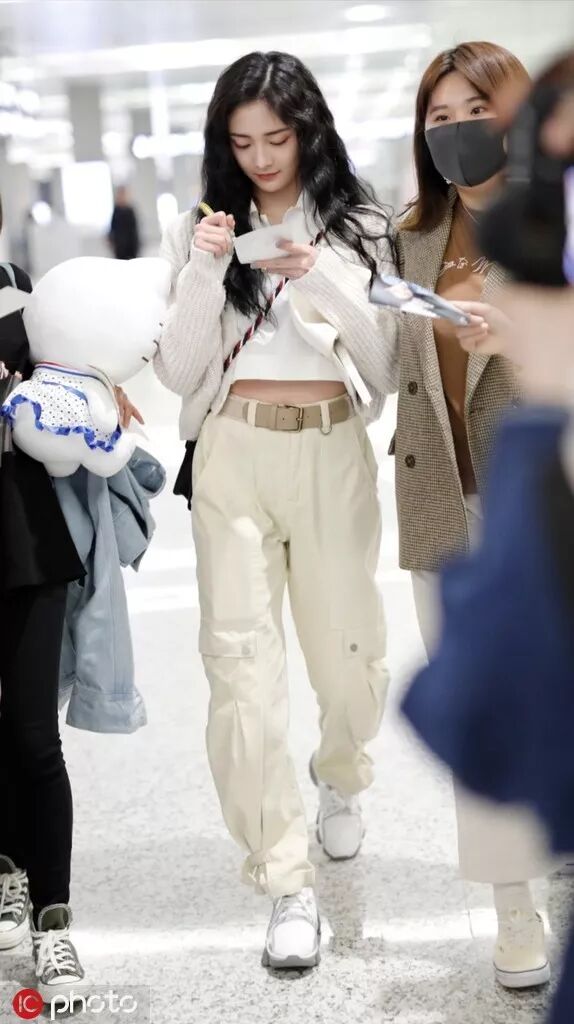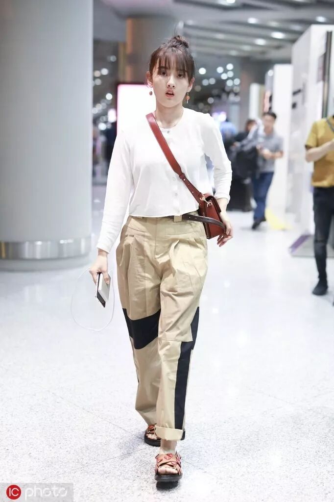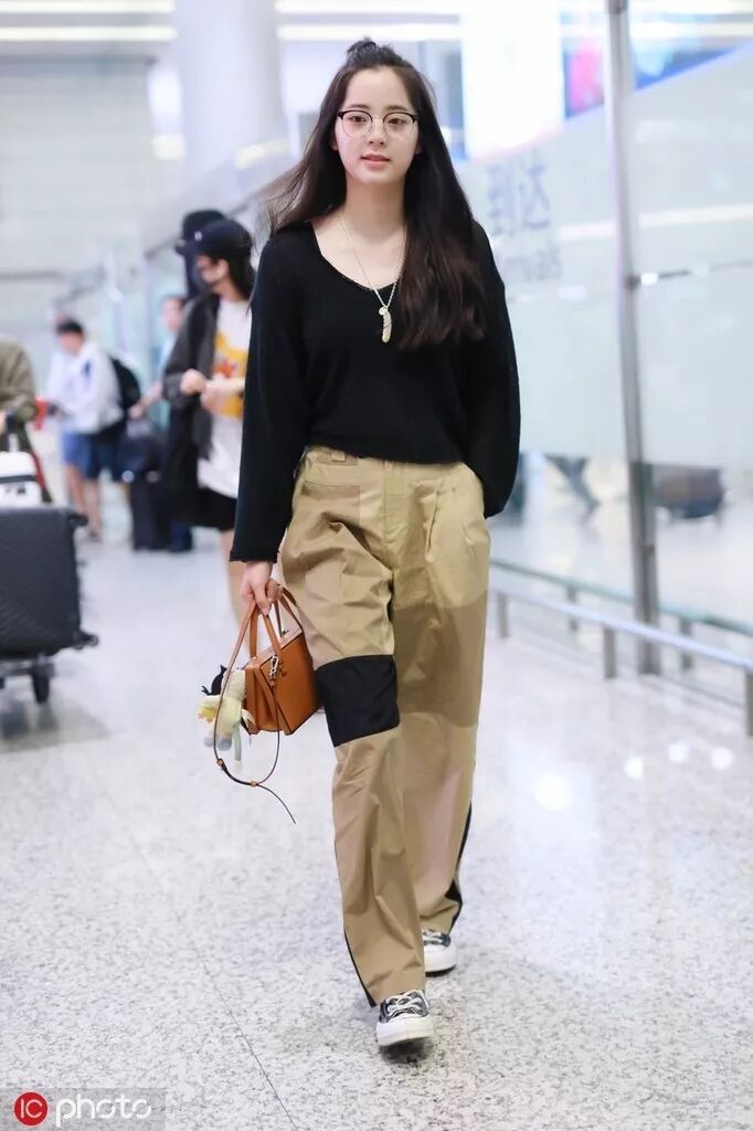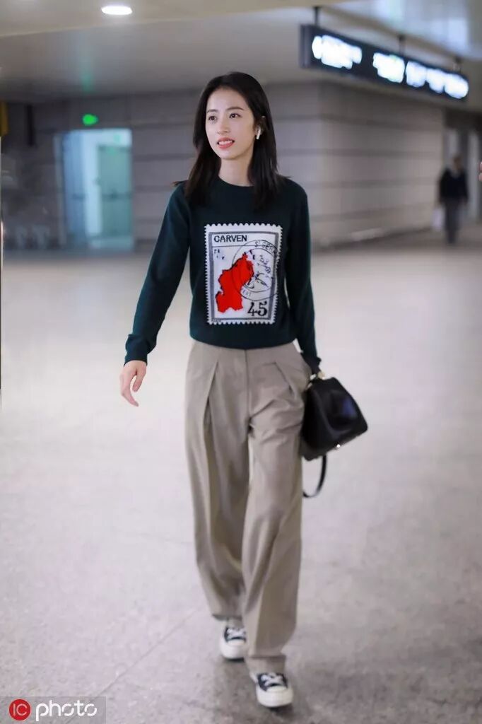 周雨彤这条工装裤带有阔腿效果,所以这种裤装一定要配短款的卫衣,而且切勿过于oversize。