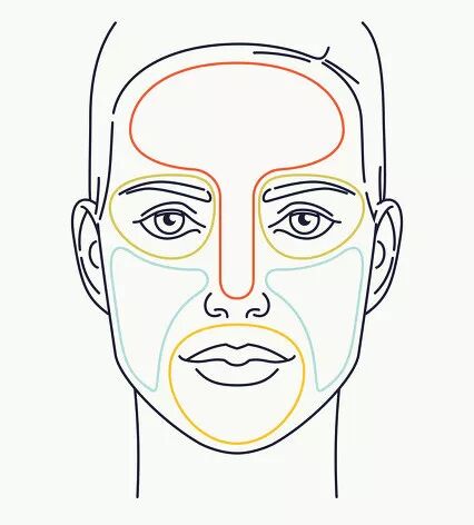 最常见的就是把面部区域区分成T区和U区。T区通常是额头到鼻子的部分,呈现一个字母T;U区则是从一侧脸蛋经过下巴到另一侧脸蛋部分,呈现一个字母U的形状。另外一个分区就是眼周肌肤了。