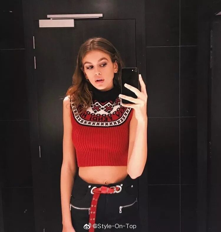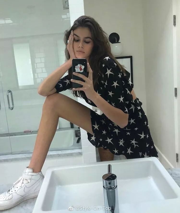 除此之外,Kaia的自拍也是值得学习的范本。如何在镜子前拍出大片,看她的pose就行了。