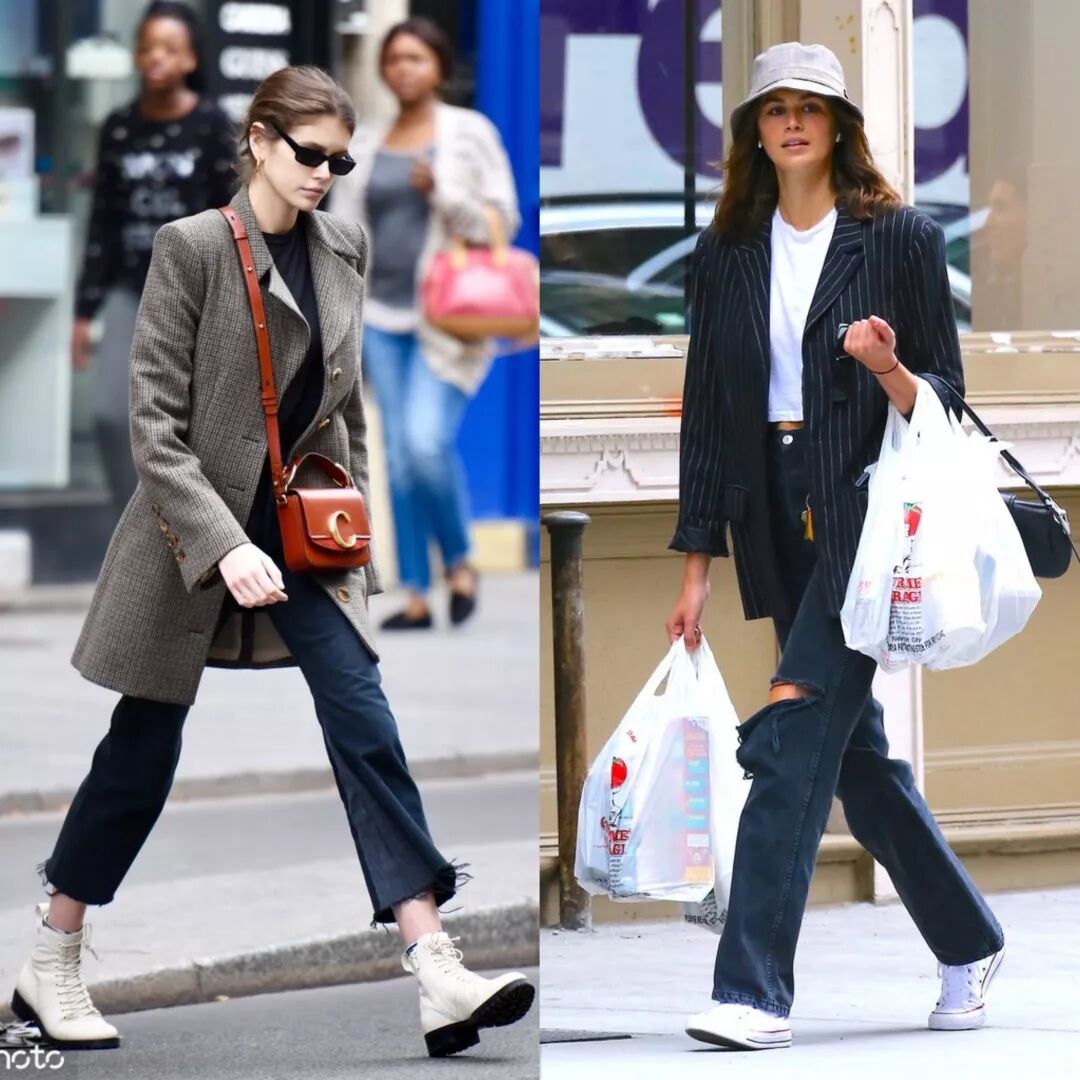 Kaia的招牌除了长腿,西装外套绝对是她衣橱出现率最高的单品,格纹、廓形、条纹,或者是长款、收腰款式,她都可以轻松驾驭,谁让人家是天生的衣架子呢?