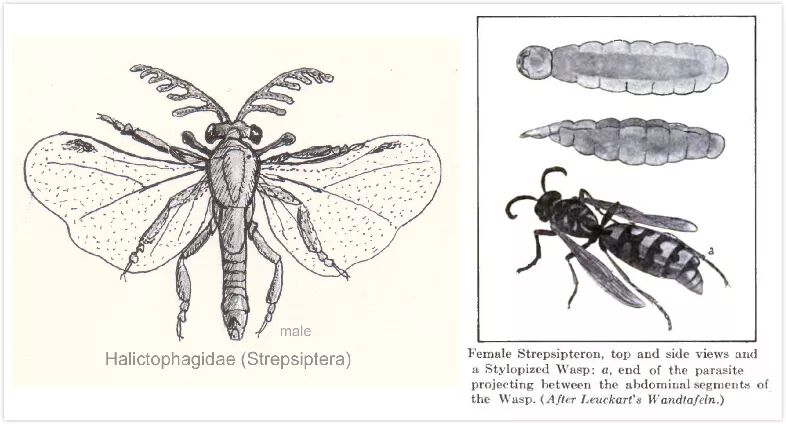左图为捻翅虫的雄性,右图上面为雌性,下图为被雌虫寄生的黄蜂。图片:Wikimedia