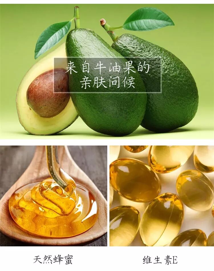 里面添加了牛油果脂,蜂蜜、维生素E、精油等滋润成分,保湿、抗氧化统统到位!