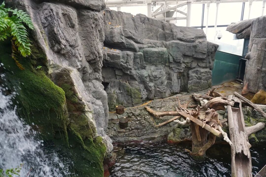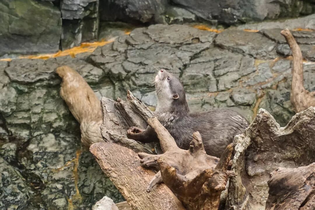 两只水獭身披银光,在水中翻滚,在鱼群中穿梭;如果从左边钻出水面,还能进到洞穴中,在石头上休息。其他水族馆也会为水獭准备水源,但是在这里,巨大的空间和复杂的水下环境,让水獭在自然环境中的姿态被尽可能地展示了出来。
