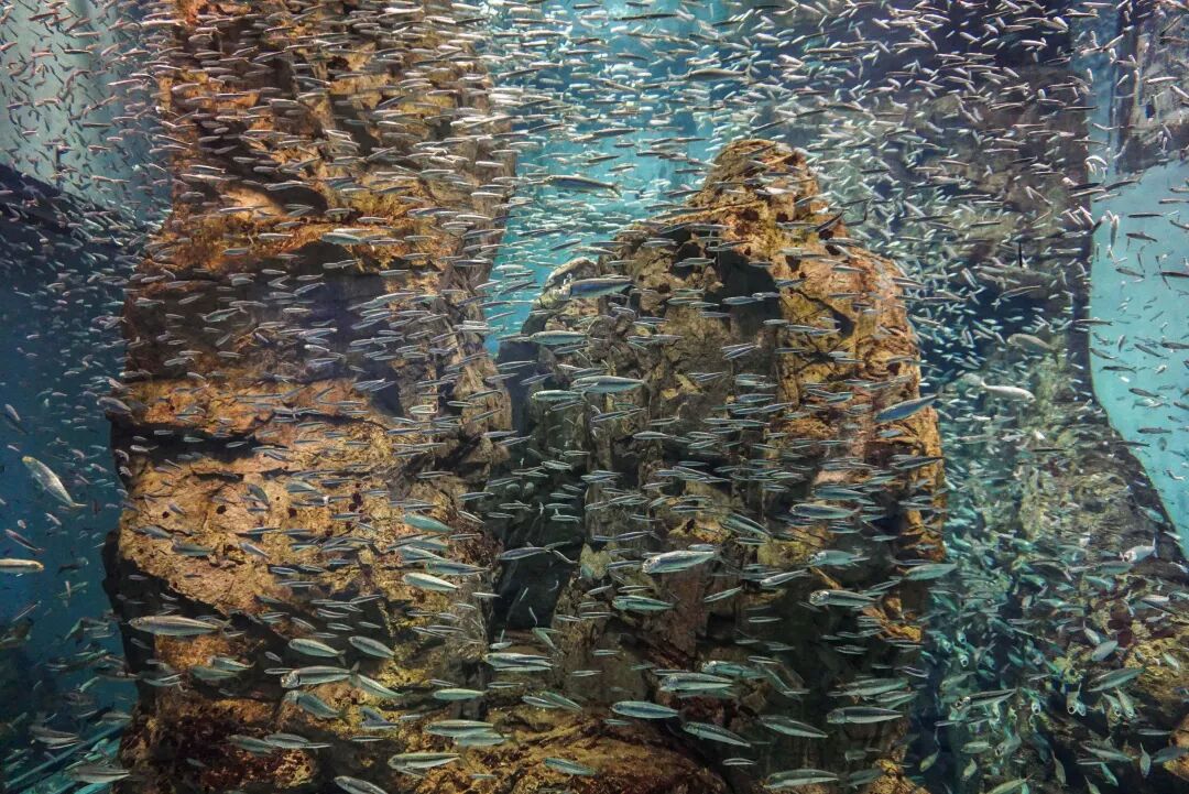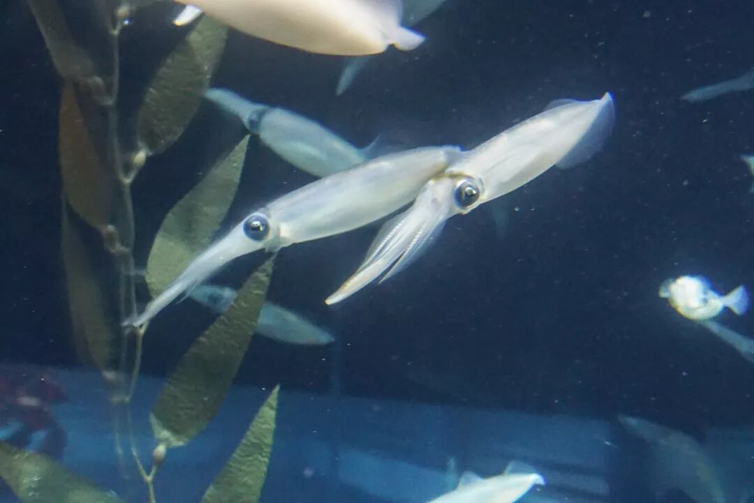 就算看似“平平无奇”的物种,大阪海游馆也能展示得很美丽,并且让游客觉得,用如此巨大的展缸绝对没有“杀鸡用牛刀”。一群莱氏拟乌贼(Sepioteuthis lessoniana)在巨大的展缸里就像漂浮的气球或果冻;只有聚成一群才能体现特点的斑点莎瑙鱼(Sardinops melanosticta)像风暴一般旋转。