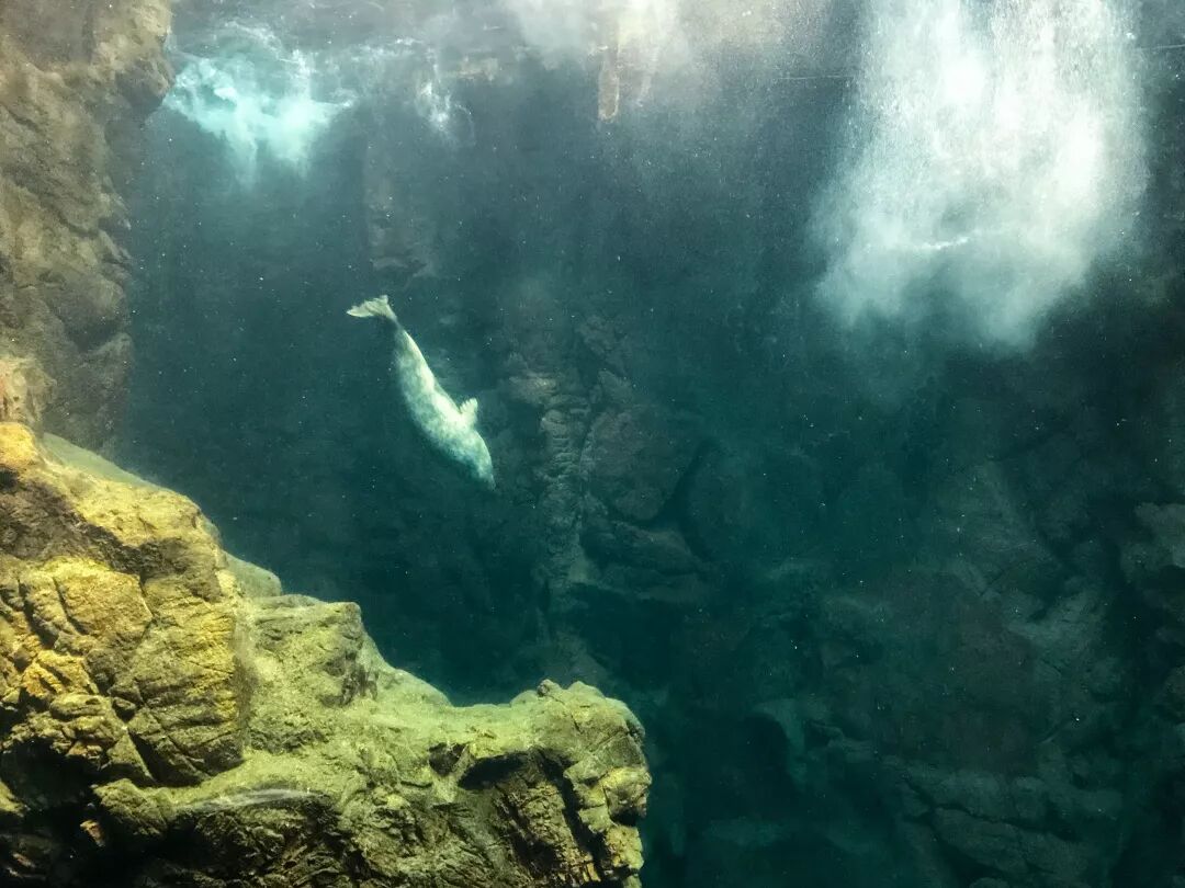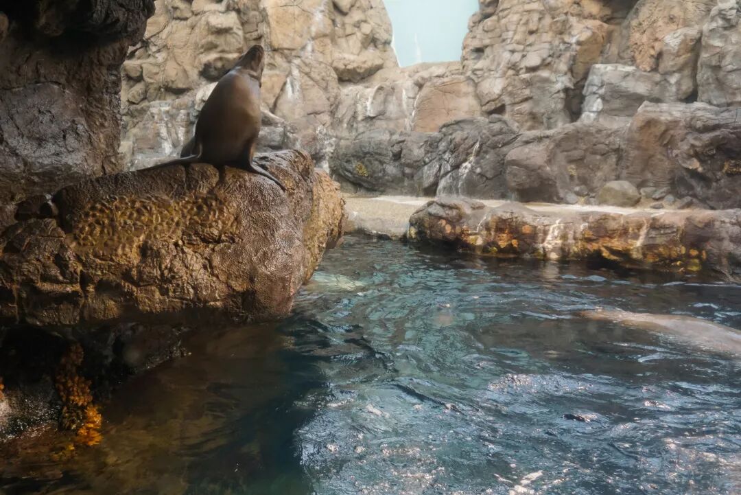 除了营造“步入海洋”的感觉,大阪海游馆还有很多展缸,用跨楼层的形式展示水面、水下或不同水深的情景。除了前面说到的贯穿两层展示的小爪水獭,在“蒙特雷湾”,位于七楼时能看到加州海狮(Zalophus californianus)和斑海豹(Phoca largha)在平台上嬉戏,然而转到下一层以及下下层,就会发现这个展缸竟然贯穿了三层:在水面之下、峭壁之间,灰色和棕色的矫健身影穿梭而过,视水压和阻力如无物,和平台上的憨态可掬完全不同。