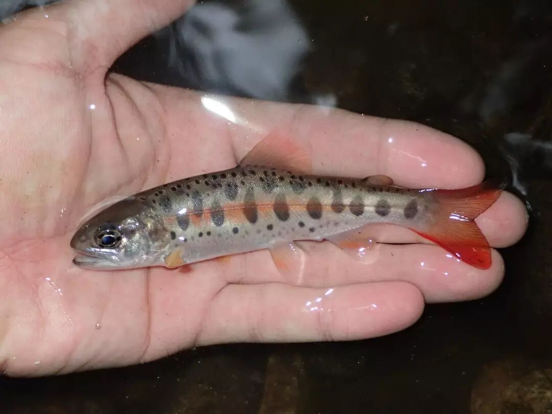 最开始簇羽海鹦就在脚边,完全看不到水下,往前走才能逐渐看到水下的山女鳟(Oncorhynchus masou masou,马苏大麻哈鱼指名亚种)。