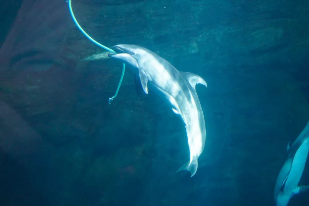 大阪海游馆展示有太平洋短吻海豚(Lagenorhynchus obliquidens),和常见的宽吻海豚相比,嘴更小,背部有花纹,不是全灰,也算是打破了大家对海豚的刻板印象。鲸豚类是水族馆的常客,满足其动物福利的要求很高。大阪海游馆的展缸里有几个用浮漂和管子接起来的玩具,海豚可以咬着玩,也算帮助减少刻板行为了。