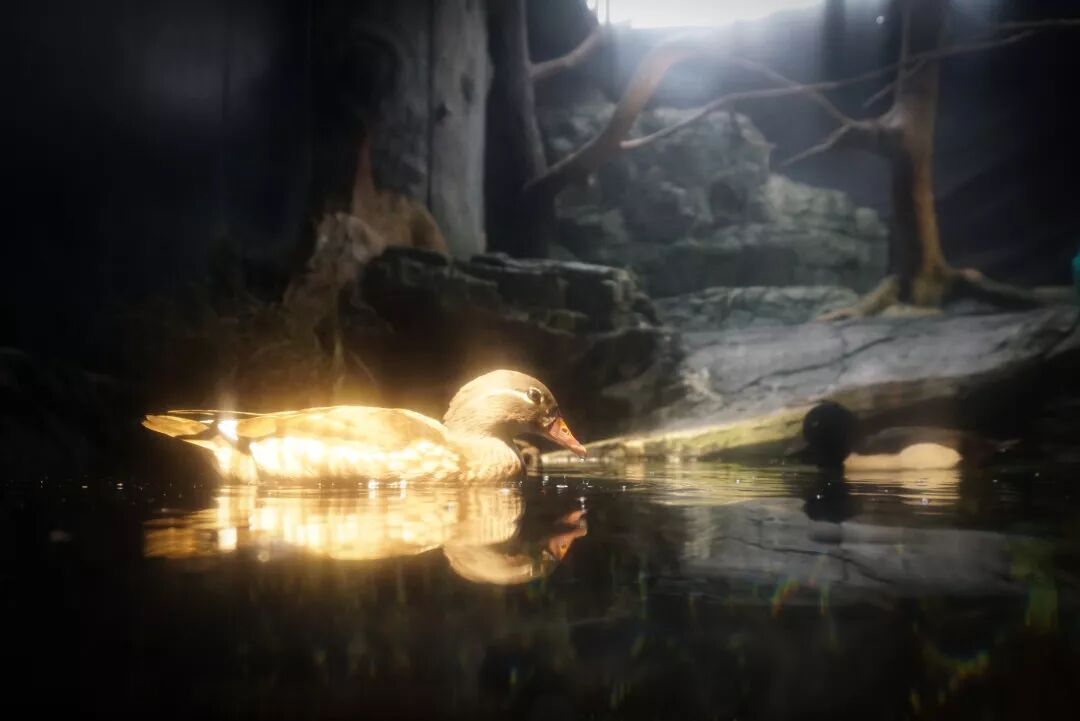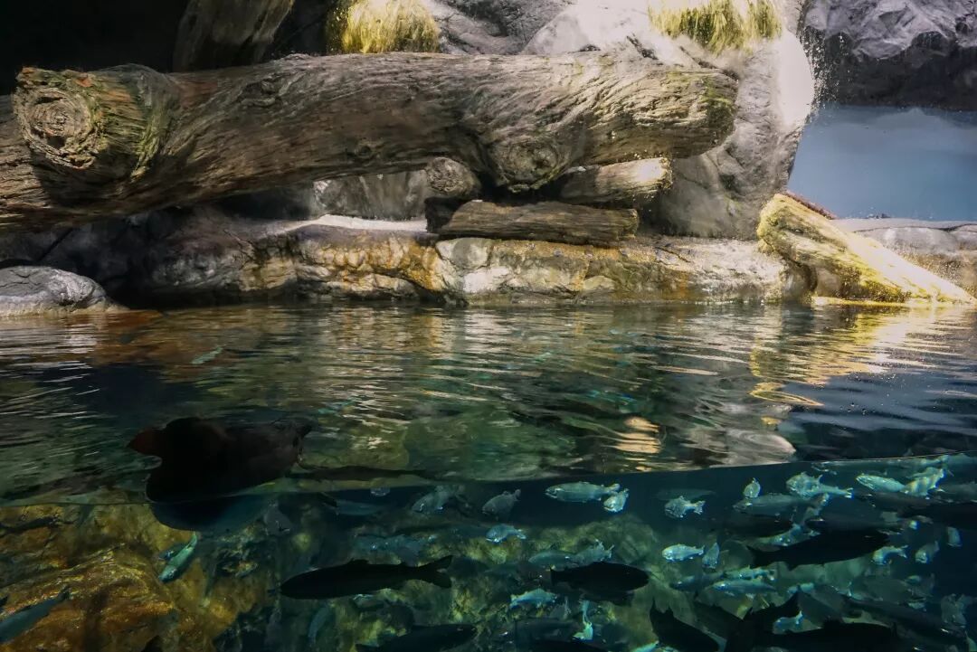 绕完一圈到了七楼,吸过鸳鸯、凤头潜鸭和日本大鲵后,我来到一个内部空间巨大、还有鱼群的展缸前。面对这些灰扑扑的小鱼,我不禁疑惑,这是什么特别的本土鱼吗?需要这么大这么深的水池……正琢磨着,两只水獭就突然冲进了我的视野!原来这是水獭展区的下方,水潭之下竟然暗藏着另一个世界。